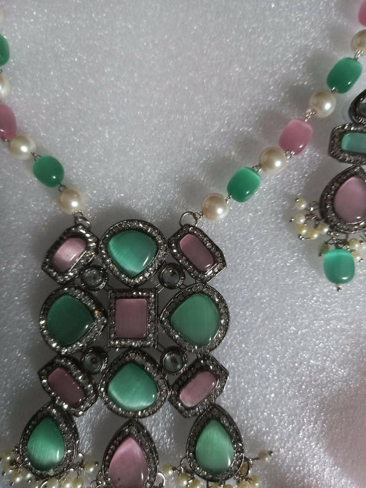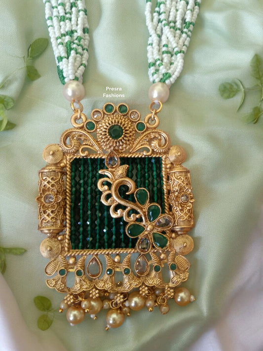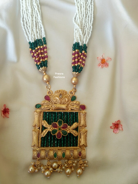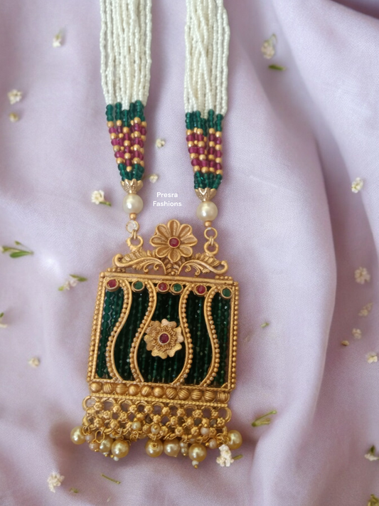 Rajwadi Moti Haram with green crystal locket MH03-Presra Fashions